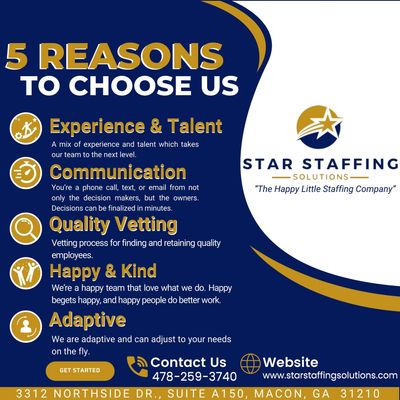 At Star Staffing Solutions, we have the perfect mix of Talent and Experience to do the job right. We communicate at high level and are always available. You can get a decision maker on the phone with one call. Finding "Good People" comes through Quality Vetting and this is our Secret Sauce. Happy begets happy and we believe happy people do better work. We love our people, love what we do and it shows in our results. Finally, we are very adaptive and we can adjust to your businesses needs on the fly. We are business owners and we understand that change is inevitable. When your business changes we aren't confined by big corporate entities dictating our every move. We are locally owned and operated, so we are able change our program as your businesses needs change.